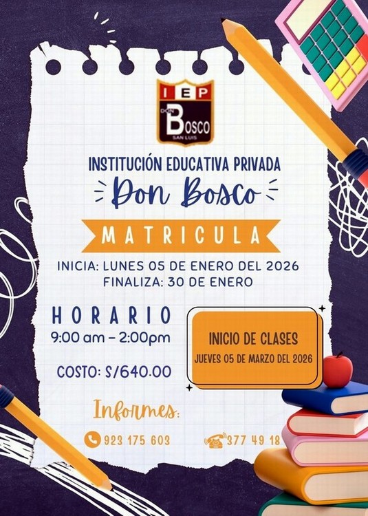 Con mucho agrado les damos la bienvenida al año escolar 2026, invitándolos a compartir con la comunidad a la I.E.P. Don Bosco, la experiencia de disfrutar cómo paso a paso, nuestros niños y jóvenes van fortaleciendo sus valores y desarrollando sus conocimientos académicos en todas las áreas.
